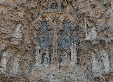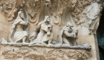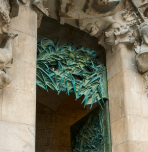 | #1 the Nativity facade … main feature here is “the entrance Gate” to the building itself right away showing that one enters ‘the mystery-Babylon region’ namely “through her own gate” — the ‘three doors’ repeat her three-fold realm (see top) hidden as ‘hope, charity and faith’ , yet the doors show dramatic foilage : >> because they couldn’t pen ‘Babylon’ on the door for obvious reasons the link is to the foilage and fauna in the scene above them of ‘Joseph’s & Maria’s Flight to Egypt’ : the Scroll has Egypt as mystery-Babylon’s land showing here ‘which Gate’ was intended (and the ‘glass’ in it represents ‘crystalline’) |
