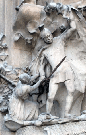 | not only through the design of his (!) ‘church’ that together with all of its weird ‘symbology’ should have featured in the Lord of the Rings but mainly because of his main crime : rejoicing his victory as ‘depicting in stone’ all the unspeakable crimes he and his overlords in their evil region since ancient times have done against Eden and her people Jacob , knowing that the latter wouldn’t understand his ugly themes in christian (‘Catholic’) lingo his real message here – since he concealed which he anyway hates and rejects |